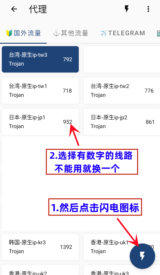 点击闪电图标可以测试节点速度延迟